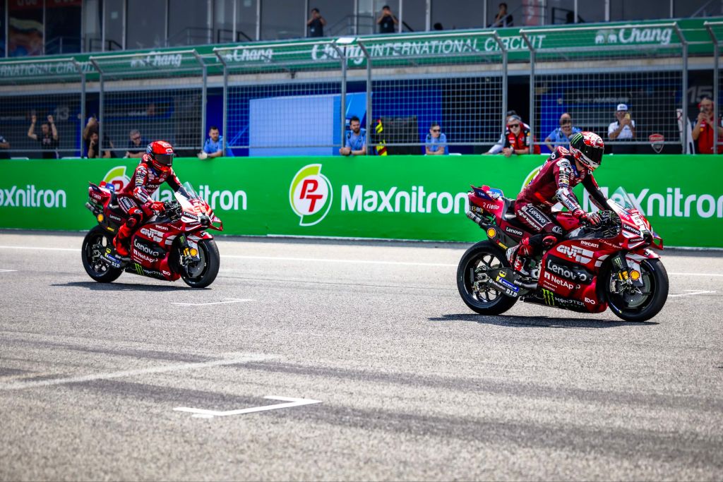 Un programma di lavoro impegnativo, per fugare gli ultimi dubbi sulla scelta del pacchetto aerodinamico, con time attack e simulazioni di gara per entrambi. Confermate le ottime sensazioni del test in Malesia, con Marc (129 giri), costretto a chiudere la sessione anzitempo, per un malessere dopo una caduta, ma capace di fermare il cronometro a 1’28.836. Nella sua scia, vicinissimo, Pecco (117 giri) con un miglior crono di 1’28.883.