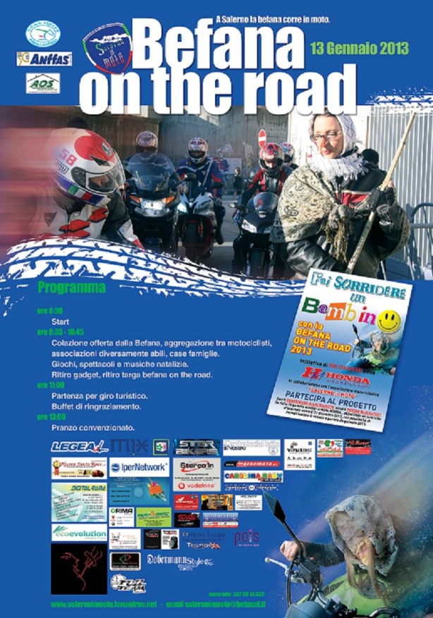 Il 13 gennaio 2013 a Salerno si terrà la 4° edizione della “Befana on the road”, evento organizzato dall’associazione motociclistica “SalernoInMoto“, che coniuga la passione per le moto con la solidarietà.