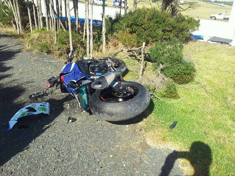 Leon Camier ,non pago del 1’31”2 stampato al mattino con gomma da gara, quando la pista era più fresca e il vento assente, al pomeriggio si è ributtato in pista quasi allo scadere con la soffice. Nel percorrere l’ultima curva, in quinta marcia ad oltre duecento all’ora è volota via nella via di fuga mentre la moto ha preso il volo sulla sabbia, superando di slancio le barriere e finendo tra le chiome degli alberi. I commissari hanno dovuto cercare i rottami tra i cespugli, mentre Leon Camier si è rialzato poco lontano impolverato e solo un po’ stordito.