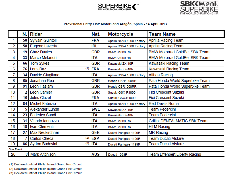 La FIM ha diffuso l’elenco dei piloti iscritti alla seconda tappa del Campionato Mondiale Superbike 2013 che si correrà in Spagna sul Motorland di Aragon.