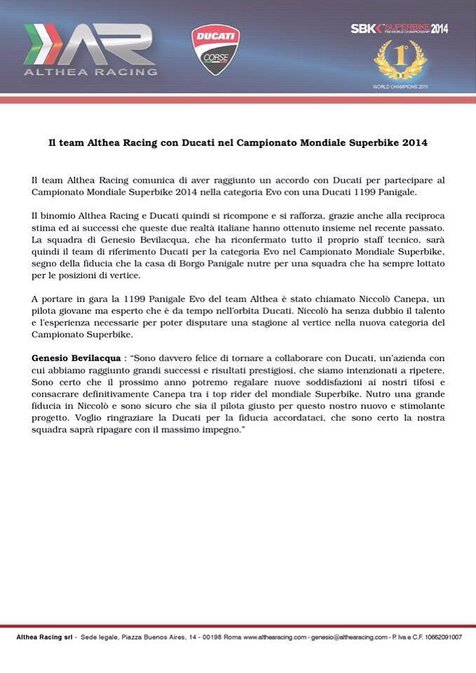 Il team Althea Racing comunica di aver raggiunto un accordo con Ducati per partecipare al Campionato Mondiale Superbike 2014 nella categoria Evo con una Ducati 1199 Panigale. Il binomio Althea Racing e Ducati quindi si ricompo ne e si rafforza, grazie anche alla reciproca stima ed ai successi che queste due realtà italiane hanno ottenuto insieme nel recente passato. La squadra di Genesio Bevilacqua, che ha riconferma to tutto il proprio staff tecnico, sarà quindi il team di riferimento Ducati per la categor ia Evo nel Campionato Mondiale Superbike, segno della fiducia che la casa di Borgo Panigale n utre per una squadra che ha sempre lottato per le posizioni di vertice. A portare in gara la 1199 Panigale Evo del team Alt hea è stato chiamato Niccolò Canepa, un pilota giovane ma esperto che è da tempo nell’orbit a Ducati. Niccolò ha senza dubbio il talento e l’esperienza necessarie per poter disputare una stagione al vertice nella nuova categoria del Campionato Superbike.