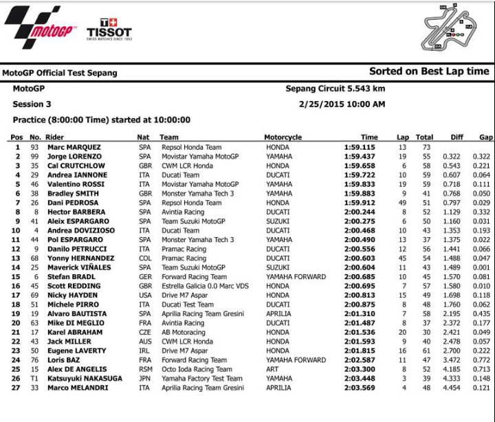 18- Michele Pirro – Ducati Test Team – Ducati Desmosedici GP15 – + 1.760 (49 giri)