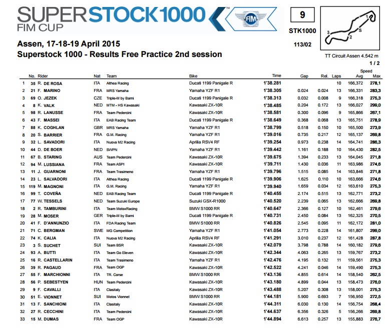 1 35 R. DE ROSA ITA Althea Racing Ducati 1199 Panigale R 1’38.281 10 166,372 278,1