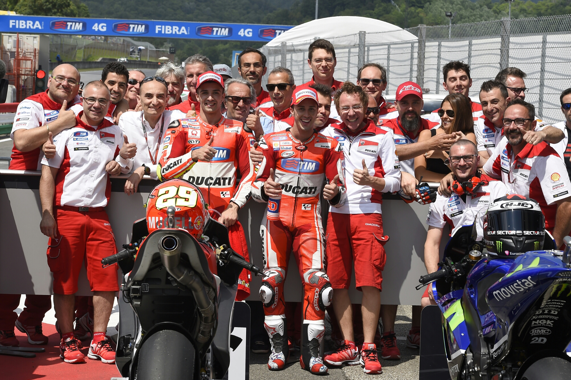 Grande prestazione dei piloti del Ducati Team quest’oggi al Mugello. Andrea Iannone, nonostante il problema alla spalla sinistra, è riuscito comunque ad effettuare un giro fantastico in Q2, facendo segnare il nuovo record della pista ed aggiudicandosi quindi la pole position per il GP d’Italia TIM di domani, la sua prima pole in MotoGP. Ottima la prova di Andrea Dovizioso, che ha ottenuto il terzo miglior crono e partirà anche lui in prima fila, di fianco a Jorge Lorenzo.