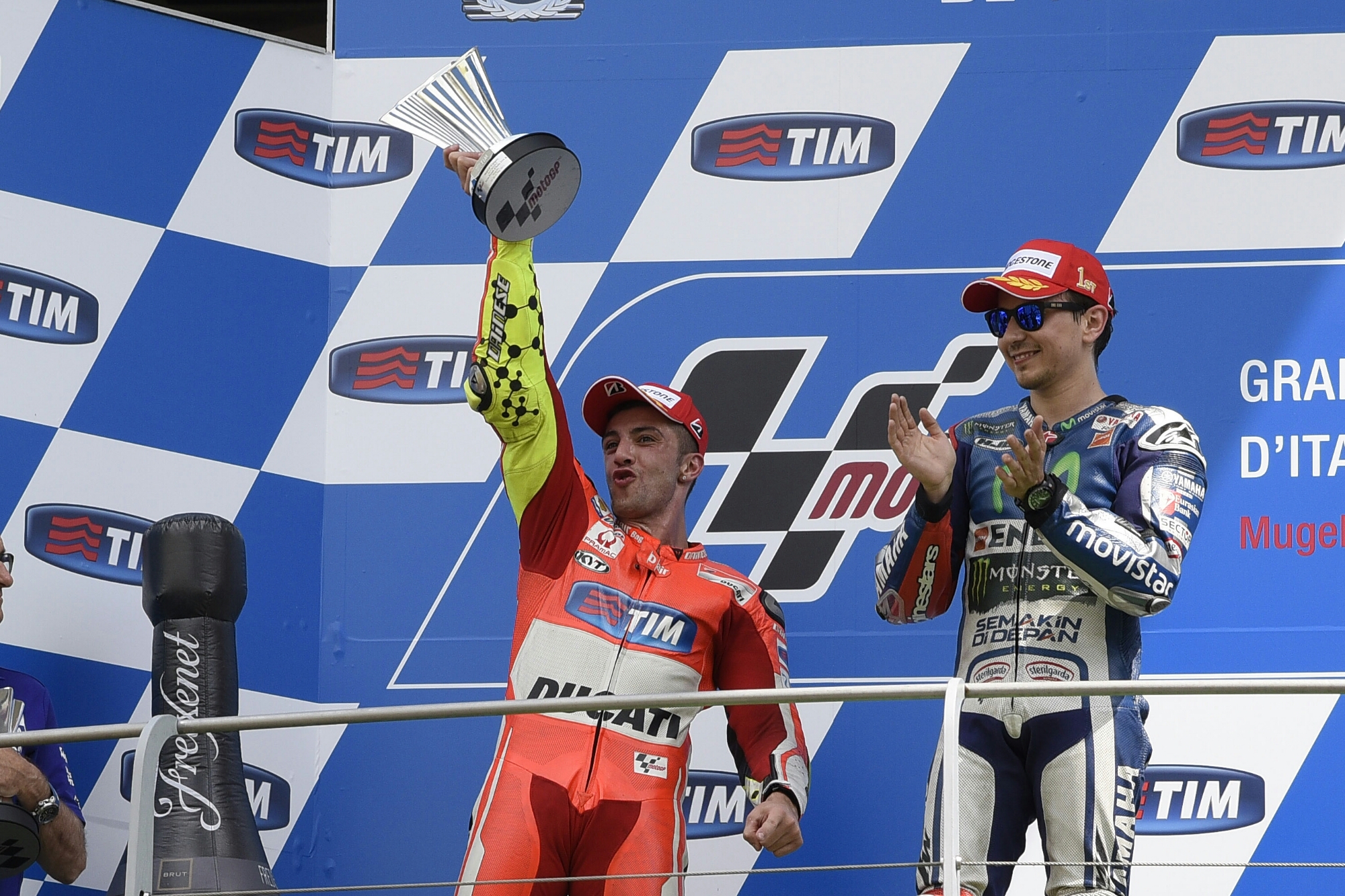 Decisamente sfortunata invece la gara di Andrea Dovizioso, che partiva anche lui in prima fila grazie al terzo miglior tempo in qualifica. Il pilota romagnolo, dopo una bella partenza, transitava al secondo posto alla fine del primo giro ed iniziava una bella lotta con Marquez. Purtroppo un problema alla corona posteriore della sua GP15 lo costringeva poi a rallentare il ritmo e a rientrare ai box nel corso del quattordicesimo giro. Nonostante il ritiro nel GP di casa, Dovizioso rimane in terza posizione nel campionato, con 83 punti.