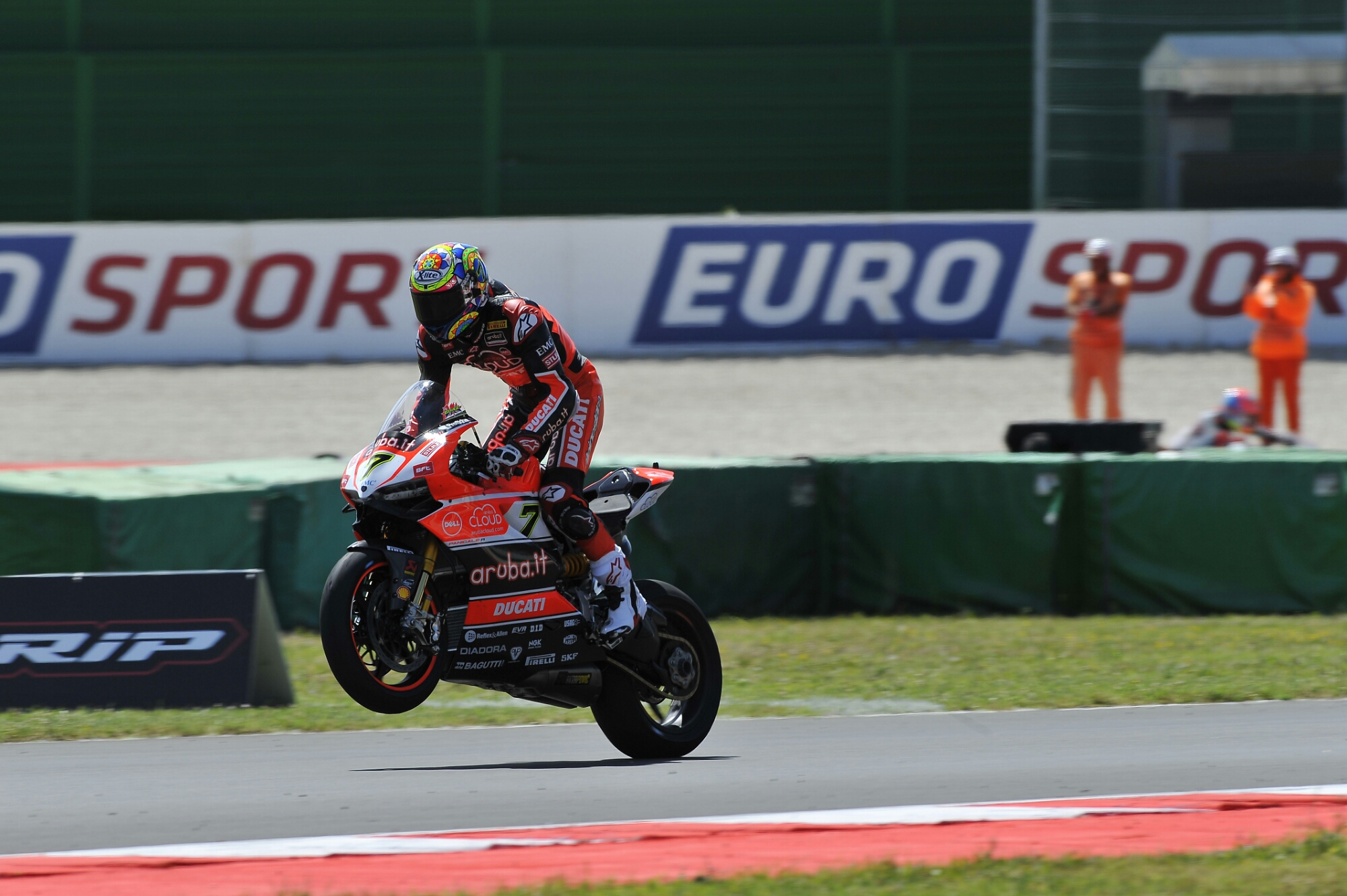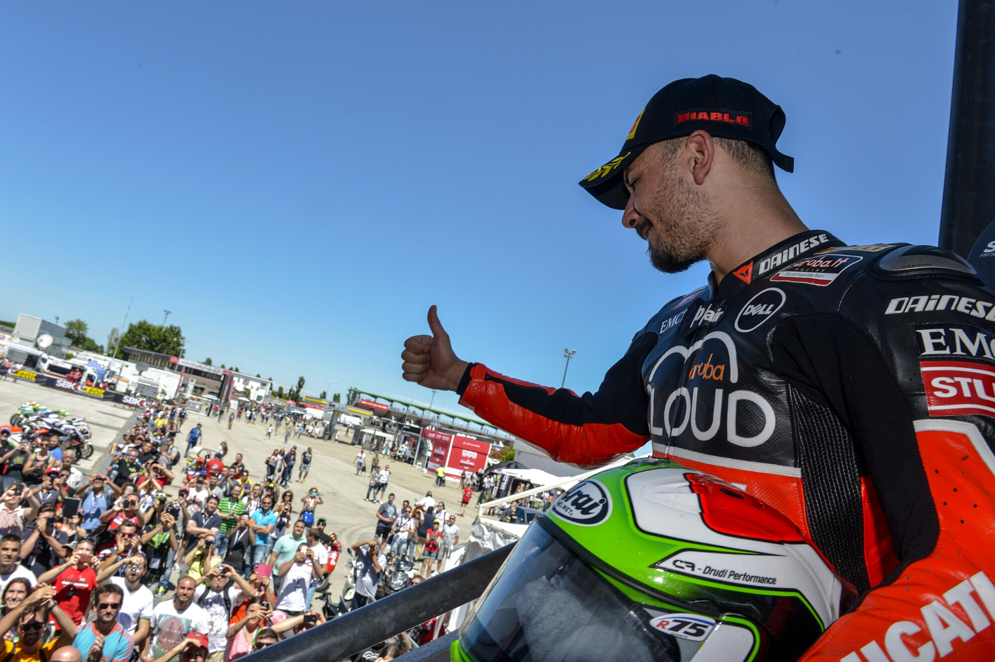 “E’ bello sapere che ho regalato alla Ducati il suo 800° podio SBK. La prima manche è stata molto divertente. Sapevo che sarebbe stato molto importante partire bene, considerando la mia posizione in griglia, e sono riuscito a farlo al meglio, prima di cominciare a lottare con Rea. Avevamo entrambi un buon passo e, nonostante alcuni momenti rischiosi, è stata una bella gara. Una delle migliori di questa stagione penso, e sono quindi contento del risultato. Mi dispiace di non aver raggiunto il podio in gara 2, ma soffrivo di una mancanza di grip e non sono riuscito a sorpassare Haslam. Comunque dobbiamo essere contenti dei risultati ottenuti oggi e adesso guardiamo avanti e pensiamo a Laguna Seca”.