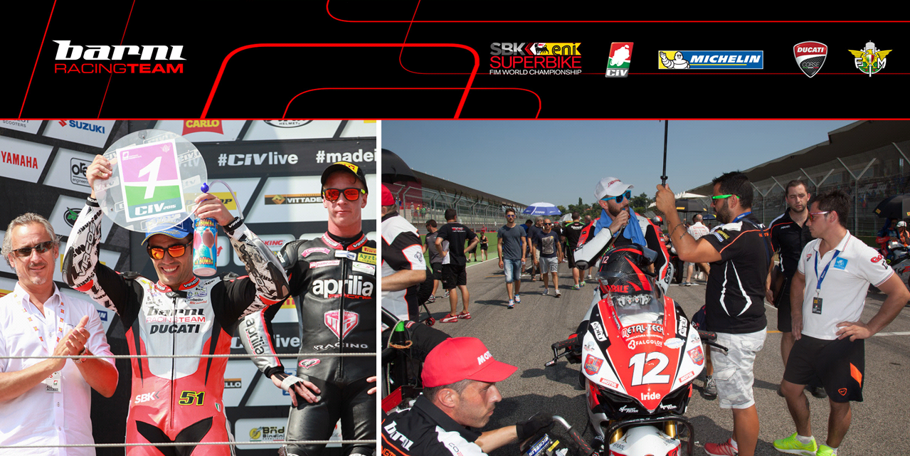 Le condizioni climatiche “al limite” registrate anche oggi all’autodromo internazionale Enzo e Dino Ferrari di Imola, in occasione dell’ottavo round stagionale, hanno complicato nuovamente le performance delle Ducati Panigale R gommate Michelin e soprattutto i piani sportivi dei piloti del Barni Racing Team, rimescolando così, ancora una volta, le sorti del titolo nazionale. Michele Pirro, giunto in terra emiliana con 44 punti di vantaggio sul compagno di squadra Ivan Goi, avrebbe potuto aggiudicarsi il titolo 2015 con due gare d’anticipo, in caso di doppia vittoria, ma nulla è stato più difficile e scontato. Già dai turni di qualificazione, entrambi gli alfieri del Barni Racing hanno faticato non poco per contrastare il velocissimo e poleman Tamburini (BMW) e la wild card di casa Kevin Calia (Aprilia), vincitori alternati delle due manche.