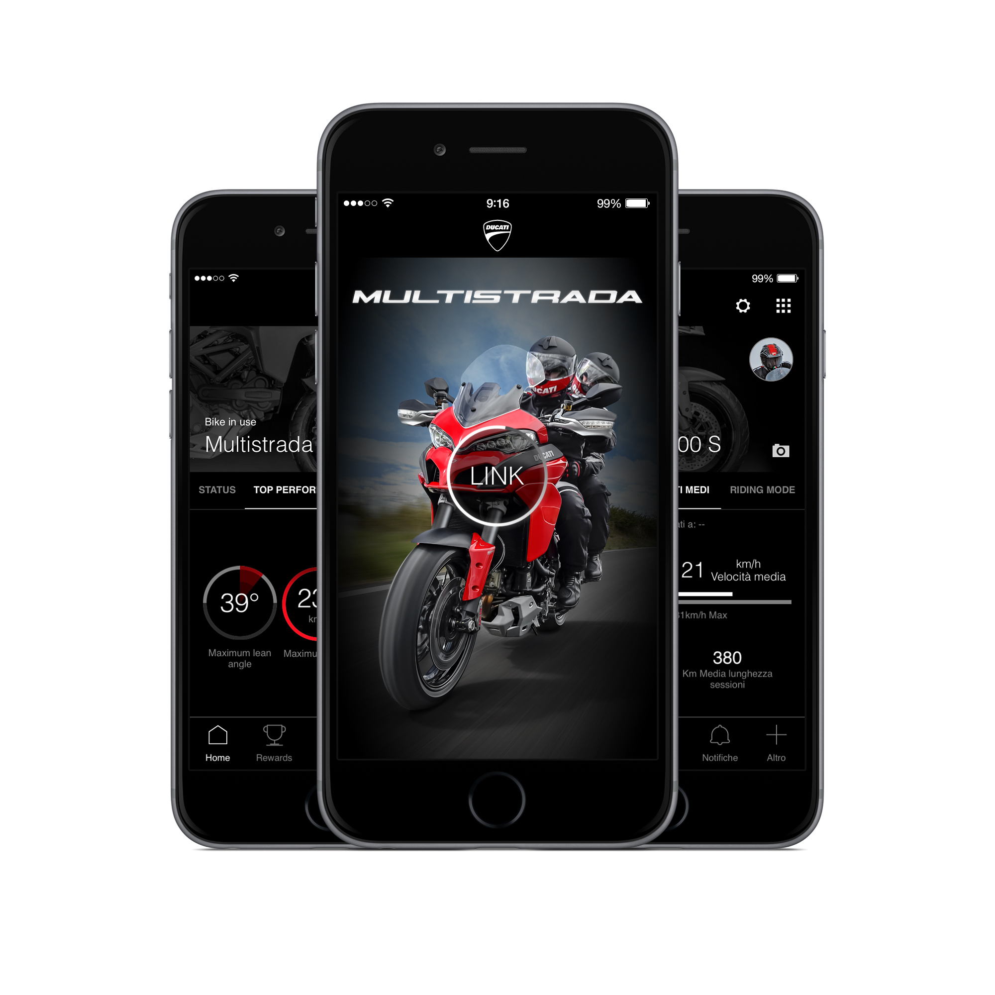 Disponibile per il sistema operativo iOS, e a breve anche per Android, Multistrada Link registra e visualizza le prestazioni della moto e del motociclista, le informazioni sulla guida e sul percorso e offre la possibilità di condividere sui social tutta l’esperienza del viaggio.