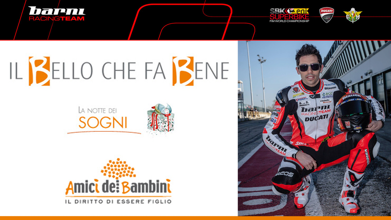 l Barni Racing Team ha avuto l’onore di partecipare a “Il Bello che fa Bene 2015”, l’annuale e prestigioso evento di beneficienza che celebra il matrimonio tra eccellenza e solidarietà. Il Team ha messo a disposizione per l’asta il casco di Michele Pirro autografato dal neo campione CIV 2015 e tester MotoGP Ducati. Per la squadra è stato motivo di orgoglio prendere parte ad una manifestazione benefica, spostando quindi momentaneamente la propria attenzione dal mondo delle moto per rivolgersi ad una realtà che merita un forte interesse. La serata è stata organizzata dall’Associazione Amici dei Bambini (Ai.Bi.), organizzazione non governativa costituita da un movimento di famiglie adottive e affidatarie, presso il Palazzo delle Stelline di Milano, ed ha visto la presenza delle più influenti aziende del mondo del design, della moda, della tecnologia e del food&beverage. L’esposizione di oggetti di lusso e di design durante il cocktail d’apertura ha permesso ai partecipanti di dare il proprio contributo sostenendo i progetti di Amici dei Bambini. A seguire la cena di Gala, offerta da aziende che hanno collaborato, durante la quale sono stati battuti all’asta alcuni oggetti unici donati dai prestigiosi partner. All’evento erano presenti alcuni volti noti dello spettacolo come Melissa Satta, Savino Zaba e Tata Francesca (SOS Tata), testimonial d’eccezione che hanno già da tempo abbracciato e sostenuto la mission di Ai.Bi. Inoltre, c’è stato spazio per le risate grazie alla presenza di Antonio Ornano, brillante comico di Zelig.