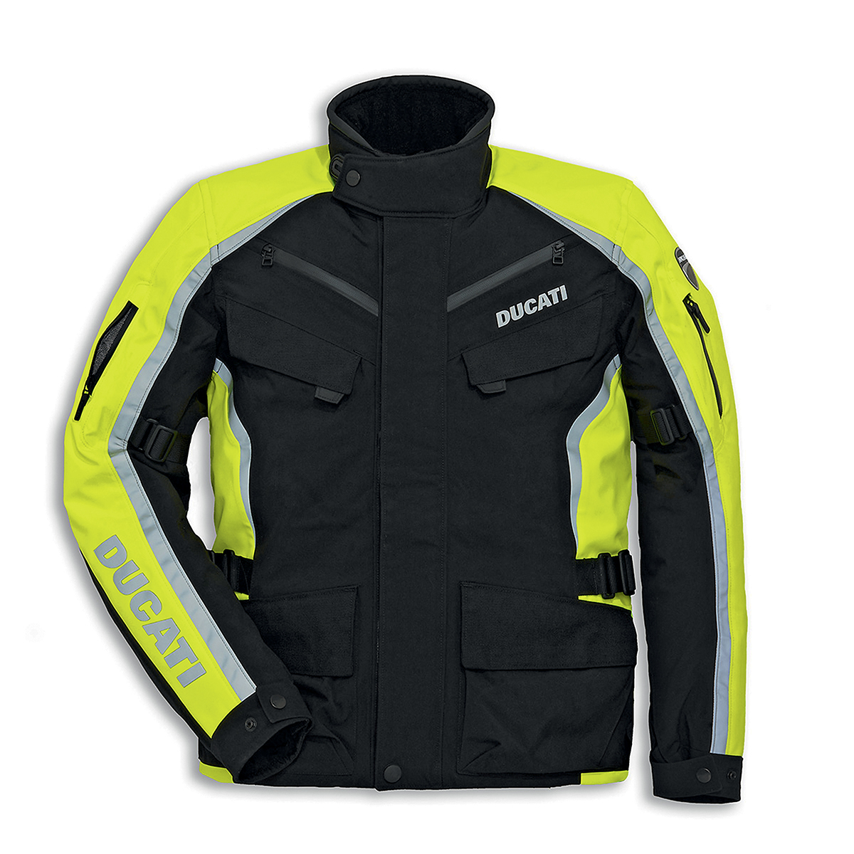 Il casco HV-1 Pro si abbina perfettamente alla giacca Tour HV in tessuto e prodotta da Rev’it! Sicurezza e versatilità sono i punti chiave di questo capo Ducati, progettato per i lunghi viaggi ma ideale anche per gli spostamenti quotidiani. Grazie all’interno removibile, la giacca Tour HV può essere utilizzata in tutte le stagioni ed è particolarmente indicata in caso di maltempo quando gli inserti in tessuto giallo certificato ad alta visibilità e le stampe reflex garantiscono maggiore sicurezza. La giacca è dotata di protezioni CE su spalle e gomiti ed è predisposta per l’inserimento del paraschiena G2 Wave (da acquistare separatamente). La membrana interna assicura l’impermeabilità al 100%.