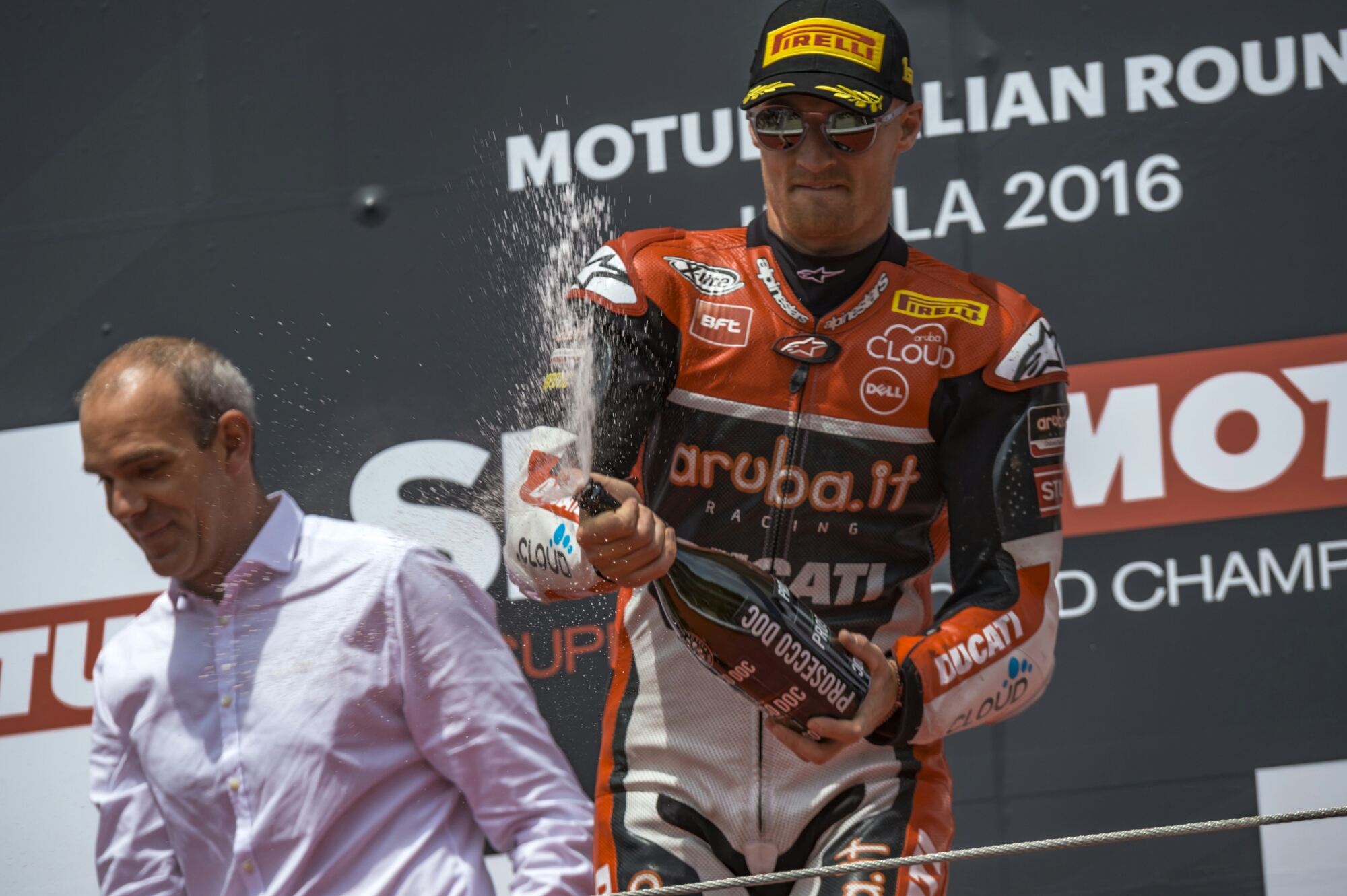 Il team Aruba.it Racing – Ducati è salito in cima al podio con Chaz Davies ad Imola, tracciato “di casa” del Costruttore di Borgo Panigale ed oggi meta di tanti appassionati ducatisti che hanno fatto sentire il loro tifo nel paddock e nelle tribune. Una gara condotta dalla prima all’ultima curva da parte del gallese, che dopo aver primeggiato in ogni sessione di prove ha colto la Superpole il sabato mattina per poi portare la Panigale R alla prima, storica vittoria su suolo italiano.