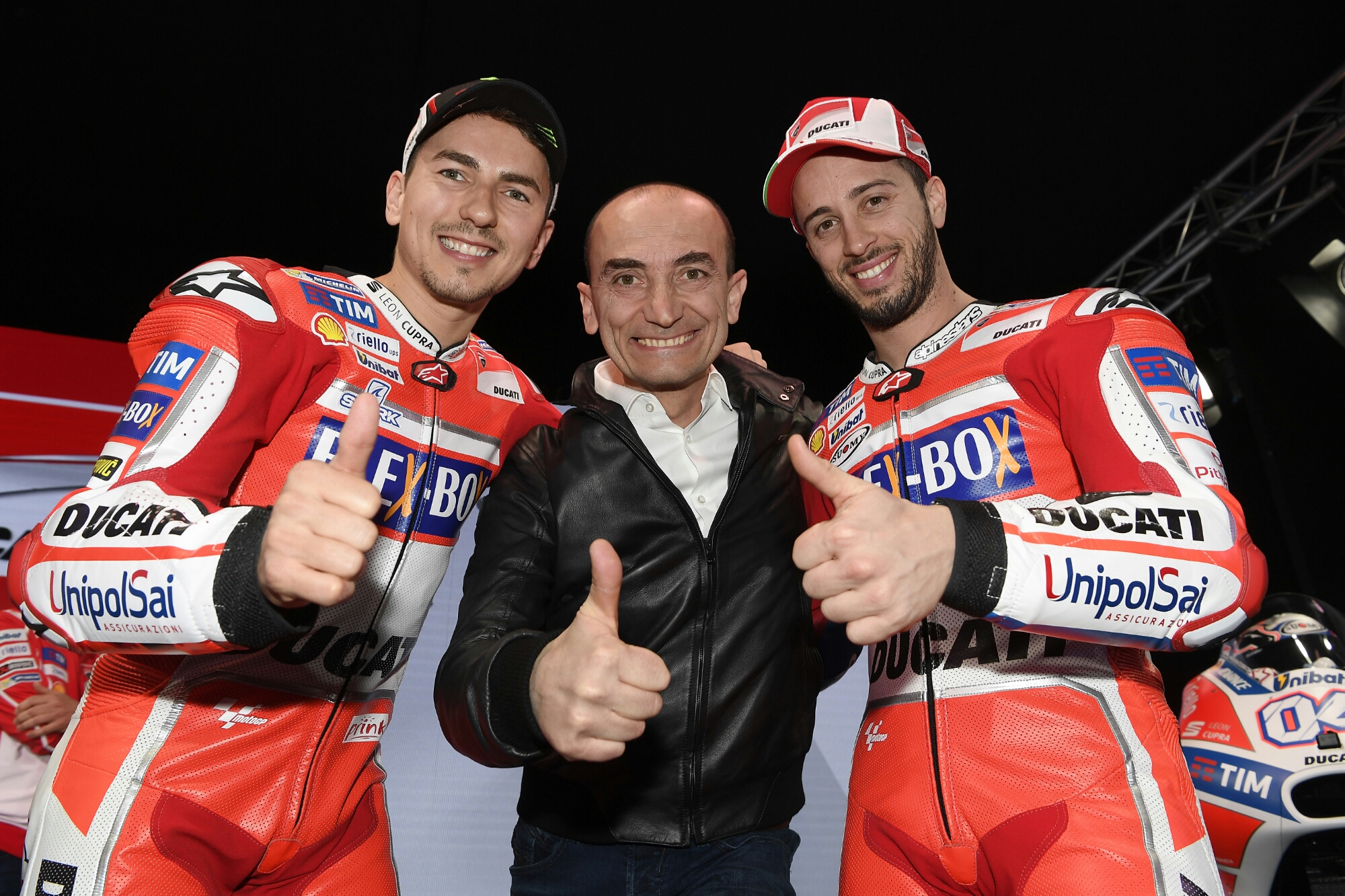 Luigi Dall’Igna, Direttore Generale di Ducati Corse, ha poi aggiunto: “Dopo una stagione 2016 che si è conclusa in modo positivo, ora siamo pronti per questa nuova stagione. Ci siamo organizzati ancora meglio e in modo ancora più efficace, e per la prima volta siamo riusciti ad avere pronta la nuova moto già nei test di Valencia. Abbiamo programmato una serie di attività di sviluppo che inizieremo già dalla prossima settimana con i nostri due collaboratori Michele Pirro e CaseyStoner, per proseguire poi nei test successivi con i nostri piloti ufficiali, e solo in Qatar vedremo la vera moto 2017. Sappiamo che i nostri avversari saranno molto agguerriti, ma noi abbiamo Jorge Lorenzo e Andrea Dovizioso in squadra e questo ci dà la fiducia necessaria per il lavoro che abbiamo davanti. Non sarà facile vincere contro i nostri avversari e non partiamo come favoriti, ma ci proveremo e daremo il massimo per ottenere i risultati che i nostri tifosi si aspettano.”