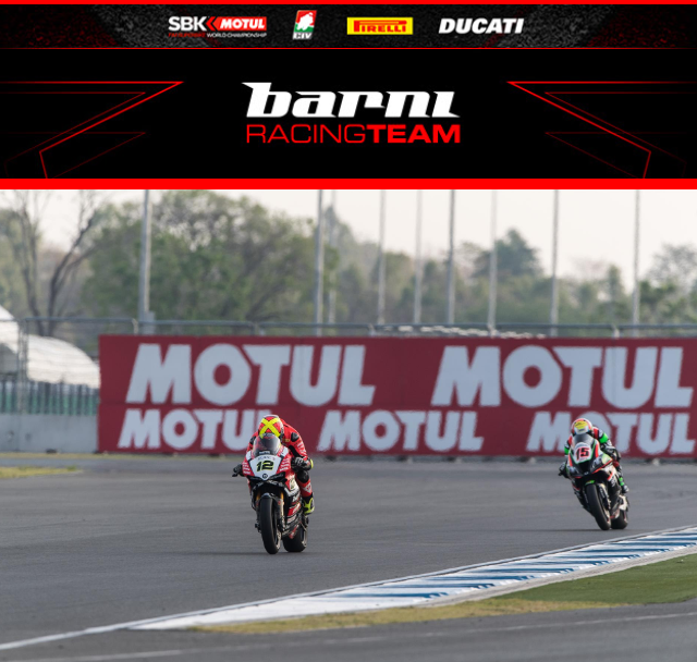 Xavi Forés chiude con un ottavo il week end di Chang in Thailandia, secondo appuntamento del MOTUL WorldSBK. Scattato dall’undicesima posizione per il piazzamento in gara 1 il pilota del Team Barni ha mantenuto la posizione per i primi quattro giri quando la gara è stata interrotta per la brutta caduta di Savadori che ha rotto il motore della sua Aprilia e costretto la direzione gara a esporre la bandiera rossa per pulire la pista dall’olio rimasto sul tracciato. Alla ripartenza, per una gara sprint di soli sedici giri con la griglia determinata dall’ordine di classifica al giro 4, il pilota del Team Barni è quindi scattato dalla decima casella. Nella seconda mini-gara Forés ha avuto una partenza non brillante perdendo posizioni, ma – grazie alla grande affidabilità della sua Ducati panigale R – è riuscito a mantenere un buon ritmo, a scavalcare la Kawasaki di A. De Angelis e poi a sfruttare i ritiri di Bradl, Laverty e Camier per prendersi l’ottava posizione sotto la bandiera a scacchi. Grazie ai punti guadagnati in Thailandia Forés è adesso al sesto posto della classifica mondiale con 34 punti. Dopo i primi due week end intercontinentali adesso il team e le moto rientreranno nel quartier generale di Calvenzano (BG) per preparare al meglio la tappa spagnola di Aragon del 31 marzo – 2 aprile.