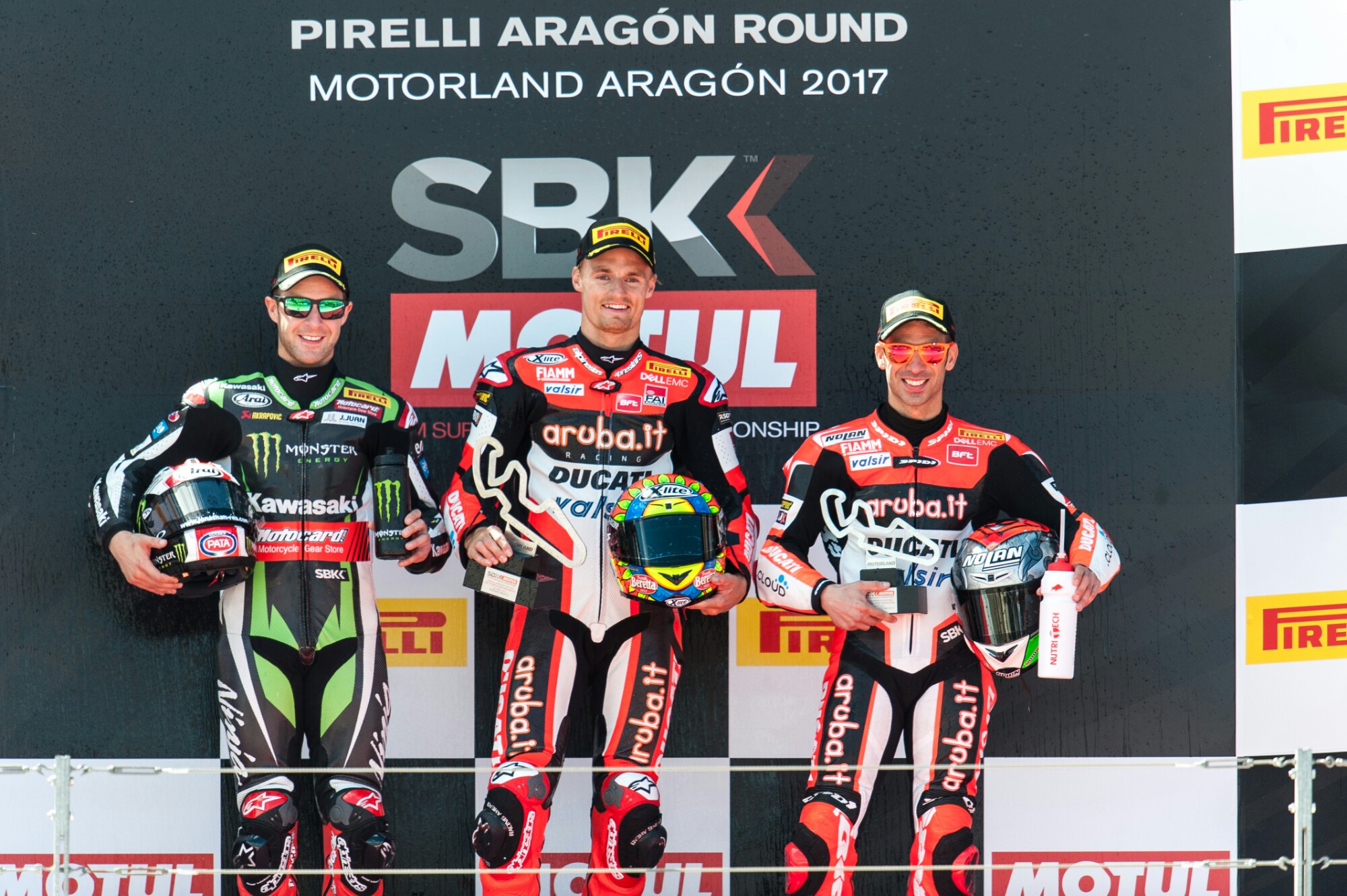 Il team Aruba.it Racing – Ducati ha centrato la prima vittoria stagionale in Gara 2 del Campionato Mondiale Superbike 2017 ad Aragon (Spagna) grazie ad una prestazione superlativa di Chaz Davies. Il gallese ha così riscattato nel migliore dei modi la scivolata di sabato, centrando il sesto successo sul circuito alle porte di Alcañiz e 21º in carriera. Dopo il secondo posto di ieri, Marco Melandri ha invece chiuso in terza posizione al termine di una gara particolarmente combattuta che lo ha visto lottare per la vittoria fino a due giri dal termine.