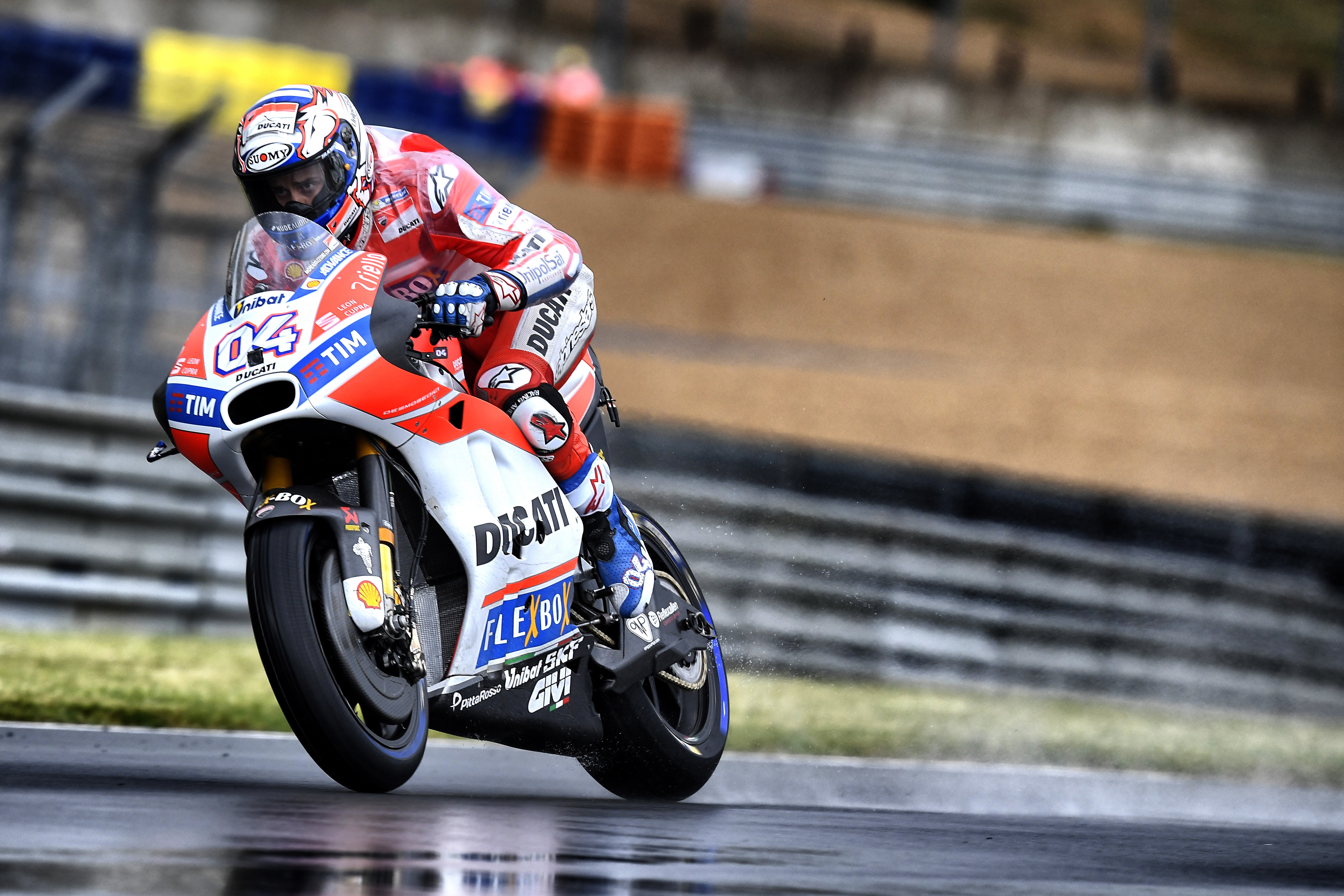 Andrea Dovizioso ha disputato un ottimo turno nel pomeriggio, sotto una pioggia piuttosto intensa, chiudendo le FP2 al primo posto con il tempo di 1’41”673. Questa mattina però il pilota romagnolo del Ducati Team non aveva montato le gomme slick verso la fine delle FP1, quando la pista si stava già asciugando, ed è quindi rimasto momentaneamente fuori dalla top ten.
