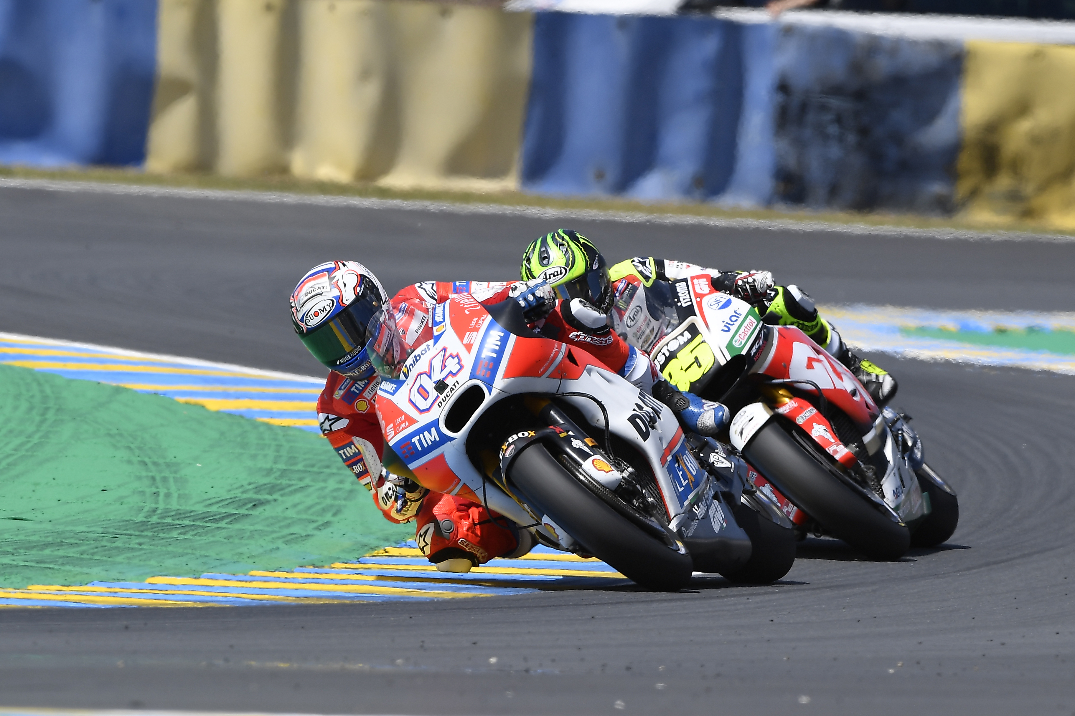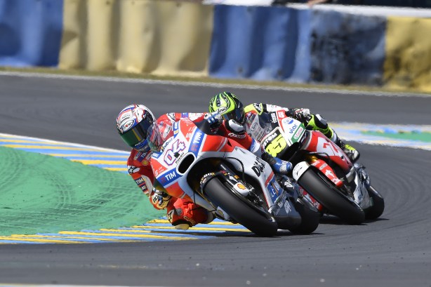 Quarto posto per Andrea Dovizioso nel GP di Francia, disputato oggi sul circuito Bugatti di Le Mans. Il pilota romagnolo del Ducati Team, che scattava dalla seconda fila grazie al sesto tempo ottenuto ieri in qualifica, ha lottato per la sesta posizione prima con Pedrosa e poi con Crutchlow e poi, a due giri dal termine, ha superato il pilota britannico e, complice la caduta di Rossi nell’ultimo giro, ha tagliato il traguardo in quarta posizione a undici secondi dal vincitore Viñales.