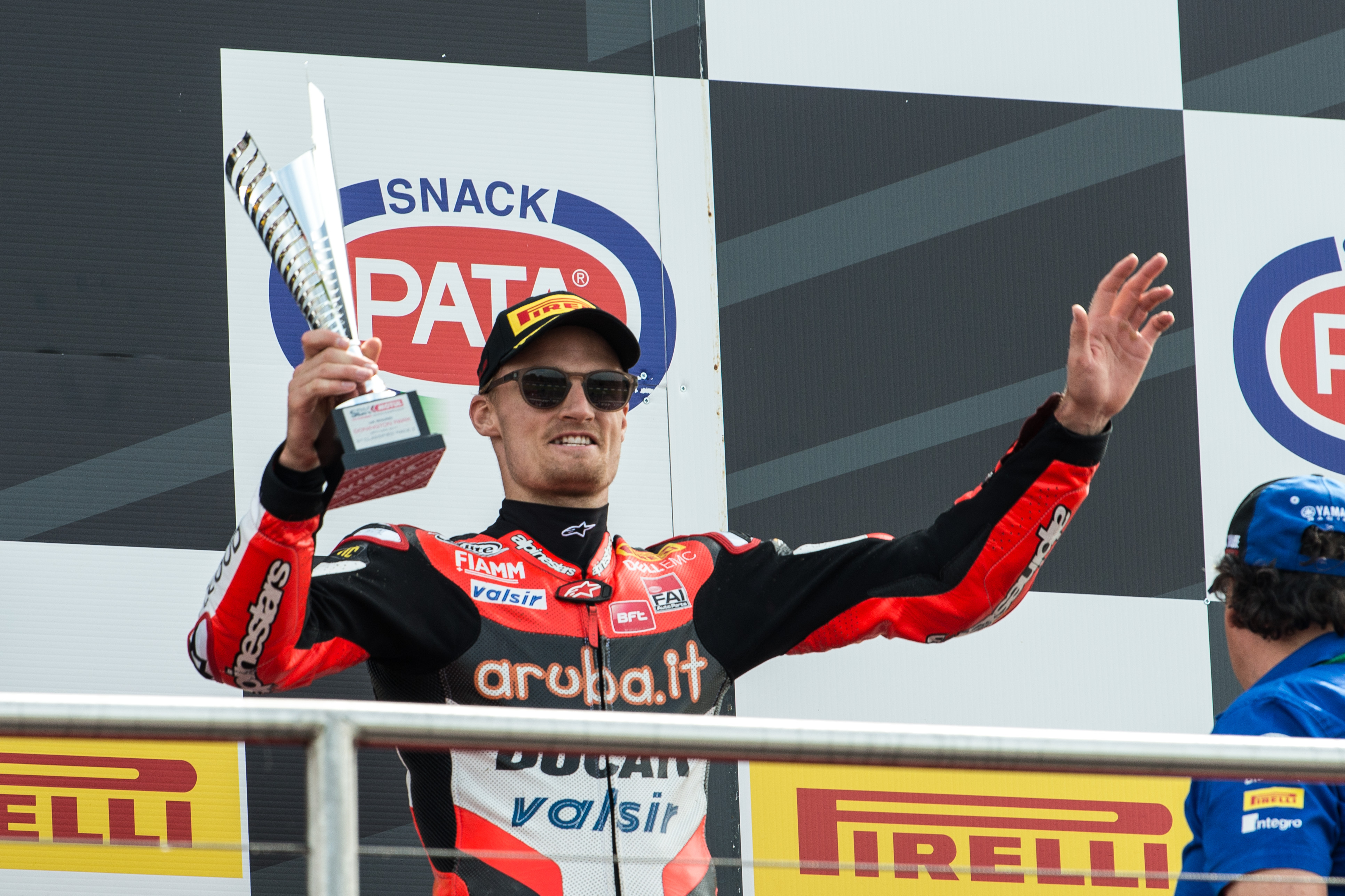 Il team Aruba.it Racing – Ducati è tornato sul podio in Gara 2 del Campionato Mondiale Superbike a Donington (Regno Unito) con Chaz Davies. Il gallese è stato protagonista di una rimonta da incorniciare dopo esser scivolato fino alla diciassettesima posizione nelle fasi iniziali della gara, quando è stato costretto ad uscire di pista per evitare il contatto con un pilota caduto, conquistando il terzo posto davanti ai tifosi britannici.