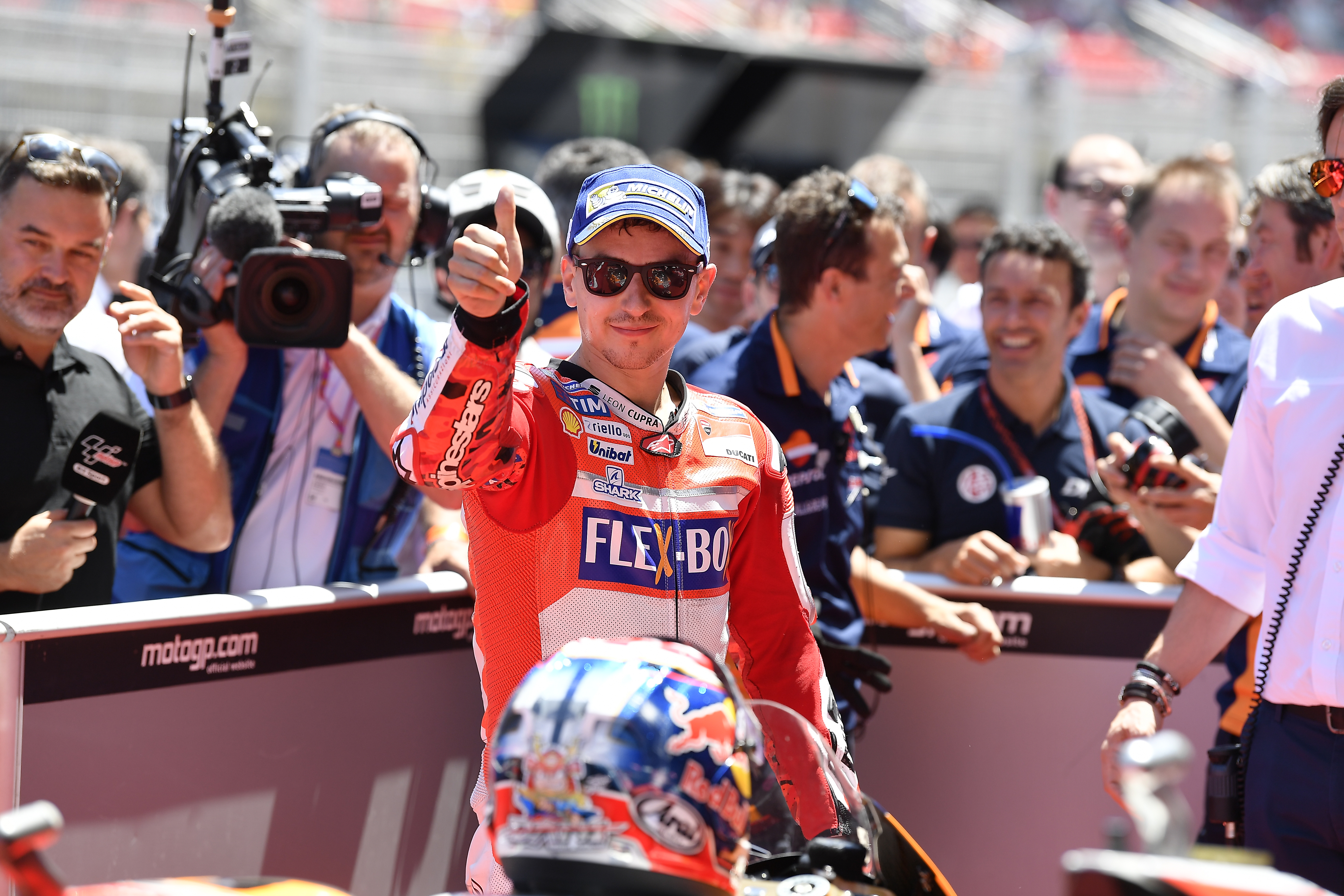 Grande prestazione in qualifica per Jorge Lorenzo, che conquista la prima fila del GP di Catalunya grazie al secondo tempo ottenuto oggi sul circuito di Montmeló. Il pilota maiorchino del Ducati Team questa mattina si era classificato in sesta posizione nella sessione di FP3, decisiva per l’accesso diretto alla Q2 a causa delle modifiche apportate all’ultima chicane del tracciato spagnolo dopo le prove di ieri. Lorenzo ha girato in 1’44”201 nel suo primo run in Q2 e domani condividerà la prima fila con il poleman Dani Pedrosa e con l’ottimo Danilo Petrucci, terzo alla guida della Desmosedici GP 2017 del Pramac Racing Team.