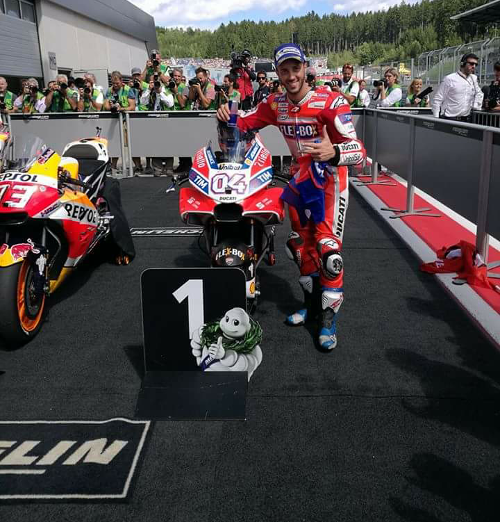 Spettacolare vittoria di Andrea Dovizioso nel GP d’Austria, che si è disputato oggi sul circuito del Red Bull Ring. Il pilota italiano del Ducati Team, che scattava dalla prima fila grazie al secondo tempo ottenuto ieri in qualifica, ha condotto una gara magistrale sempre nel gruppo di testa ed è poi passato al comando nel corso del diciottesimo passaggio. Andrea è stato poi superato da Marquez ma è tornato nuovamente in testa al GP al ventiduesimo giro ed ha mantenuto la prima posizione fino al traguardo, nonostante un attacco estremo da parte del pilota spagnolo nell’ultima curva.