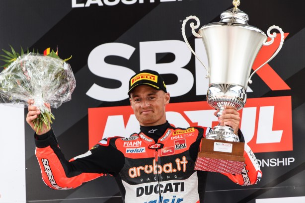 Il team Aruba.it Racing – Ducati è salito nuovamente sul gradino più alto del podio all’EuroSpeedway Lausitz (Germania) con Chaz Davies. Con la vittoria di Gara 1, il gallese ha conquistato la quinta vittoria stagionale. Dopo attimi concitati in griglia a causa di un problema al freno posteriore, Davies ha mantenuto la calma ed è stato protagonista di un’ottima partenza dalla sesta posizione. Secondo alla prima curva, Davies ha preso il comando della gara nel corso del secondo giro per poi staccare progressivamente Rea e Sykes in virtù di un ritmo costante in 1’37 basso.