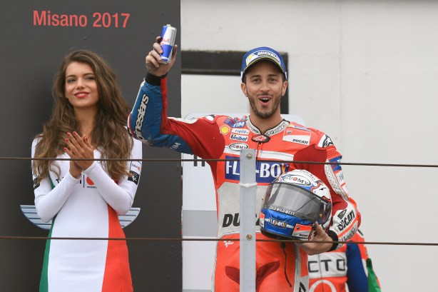 Andrea Dovizioso è salito nuovamente sul podio anche oggi a Misano Adriatico, grazie al terzo posto ottenuto nel GP di San Marino e della Riviera di Rimini, disputato sotto la pioggia. Il pilota romagnolo del Ducati Team, che scattava dalla prima fila grazie al secondo posto ottenuto ieri in qualifica, ha lottato per quasi tutta la gara con Marquez e Petrucci ma, ad alcuni giri dalla fine, si è dovuto accontentare del terzo posto finale, che gli consente comunque di confermarsi in testa al mondiale a pari punti con Marquez.