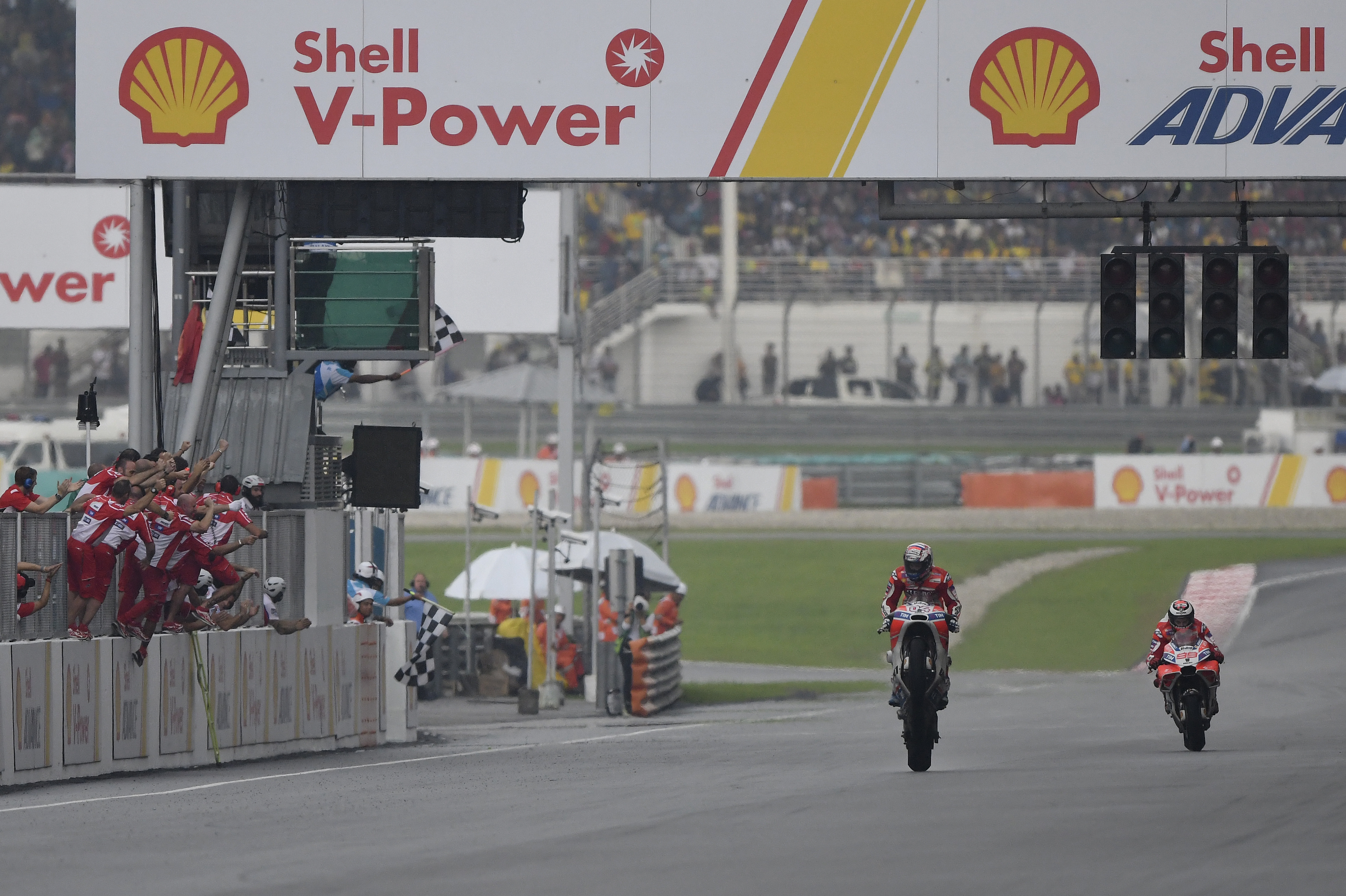 Eccezionale prestazione dei due piloti del Ducati Team a Sepang. Andrea Dovizioso ha infatti vinto il GP Shell della Malesia, disputato in condizioni di asfalto bagnato, davanti al compagno di squadra Jorge Lorenzo e tiene così aperta la lotta per il titolo mondiale che a questo punto verrà assegnato nell’ultima gara della stagione, in programma dal 10 al 12 novembre a Valencia.