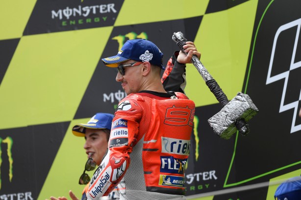 “La vittoria di oggi è stata davvero bellissima! Abbiamo dimostrato che possiamo vincere non solo entrando per primi alla prima curva, ma che sappiamo anche rimontare e superare gli altri. In verità è stata una gara complicata perché sono partito male e ho perso parecchi metri da Marquez, ma mi sono detto che la gara era lunga e che dovevo restare calmo. Non è stato troppo difficile superare Marc, perché avevo qualcosa in più in frenata, però lui mi è rimasto sempre dietro fino al traguardo. Ora abbiamo un pacchetto molto competitivo e credo che questa sia la Ducati più completa di sempre: sia io che Dovi questa settimana siamo sempre stati competitivi. Dobbiamo approfittare di questa situazione perché la Desmosedici adesso funziona bene in quasi tutte le piste, non consuma troppo le gomme, e questo è un grande vantaggio. Adesso godiamoci questa vittoria e poi penseremo alla prossima gara.”