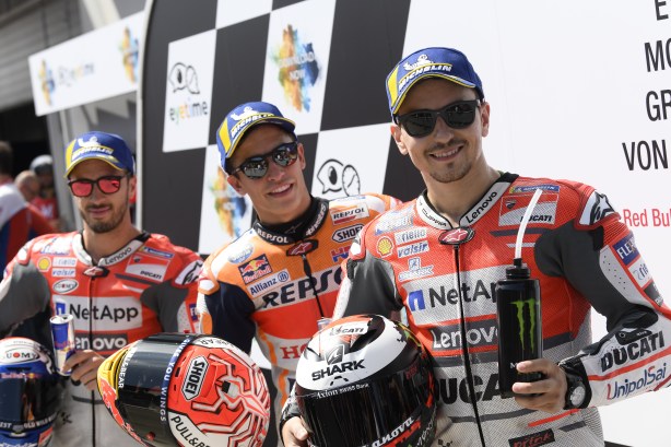 Ottima prestazione dei due piloti del Ducati Team al Red Bull Ring. Prima fila infatti per Andrea Dovizioso e Jorge Lorenzo, che si sono classificati al secondo e al terzo posto nelle qualifiche del GP d’Austria, disputate con pista asciutta dopo che le FP3 del mattino, con asfalto bagnato, non avevano modificato le posizioni di ieri.