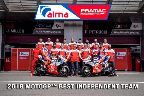 Alma Pramac Racing è il miglior Independent Team della stagione 2018 di MotoGP. Con una gara di anticipo sul termine del campionato il team di Siena conquista l’ambito premio riservato alle squadre indipendenti grazie ai 17 punti ottenuti da Jack Miller e Danilo Petrucci che hanno chiuso rispettivamente in ottava e nona posizione il #MalaysianGP. Dopo aver occupato per gran parte della stagione la quarta posizione assoluta nella classifica dei team, Alma Pramac Racing ottiene la matematica certezza della TOP 5 dietro alle factory Honda, Ducati, Yamaha e Suzuki con 46 punti di vantaggio su Yamaha Tech3. La stagione, però, non è finita. A Valencia, infatti, Danilo Petrucci avrà tutte le carte in regola per vincere il premio di First Independent Rider. Alla vigilia dell’ultima gara del 2018 il pilota di Terni è terzo nella classifica Independent a 5 punti da Zarco (quinto in classifica generale con Rins) e a 4 da Crutchlow.