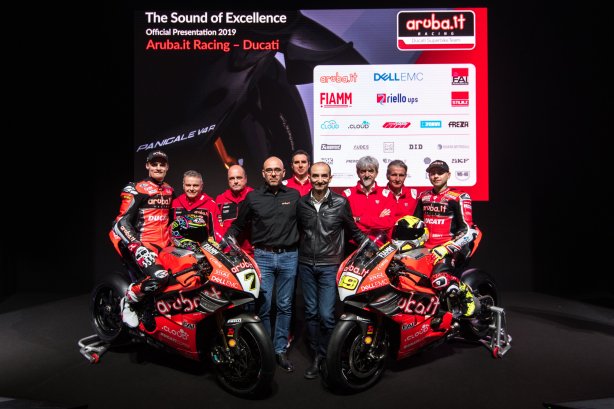 Sono due le grandi novità per la squadra italiana all’inizio della 32esima stagione del Mondiale Superbike, sia per quanto riguarda la moto che per i piloti. A livello tecnico, la stagione 2019 segna una svolta storica per la Casa di Borgo Panigale. Presente fin dalla prima edizione del mondiale nel lontano 1988 e vincitrice di 17 titoli Costruttori e 14 titoli Piloti, Ducati porterà in pista per la prima volta una Superbike a quattro cilindri – la Panigale V4 R – derivata dalla moto stradale presentata all’EICMA il novembre dello scorso anno ed acclamata dal pubblico come gioiello di stile, tecnologia e prestazioni ‘Made in Italy’. La Panigale V4 R – sviluppata sulla base dell’esperienza maturata in MotoGP – presenta numerose evoluzioni rispetto alla moto precedente, non solo dal punto di vista del motore ma anche in termini di ciclistica, elettronica e aerodinamica. A conferma del momento epocale per Ducati e Aruba, l’unveiling sul palco della Panigale V4 R è stato eseguito personalmente dai due AD delle rispettive aziende.