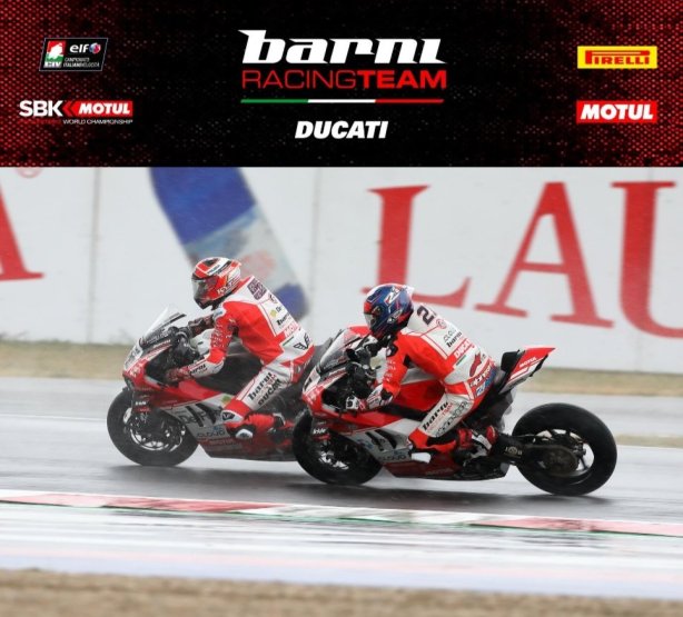 Gara 1 al Misano World Circuit Marco Simoncelli si è conclusa prematuramente per i piloti del Barni Racing Team Michael Rinaldi e Michele Pirro. Dopo una buona Superpole, che ha visto Rinaldi conquistare la settima casella seguito dal compagno di squadra Pirro, la gara – corsa sotto la pioggia – è finita per entrambi con una caduta. In condizioni molto difficili, con pioggia intermittente e scrosci torrenziali, Pirro è caduto mentre era in ottava posizione all’ottavo giro; Rinaldi è scivolato al decimo passaggio dopo una straordinaria rimonta dalla quindicesima posizione.