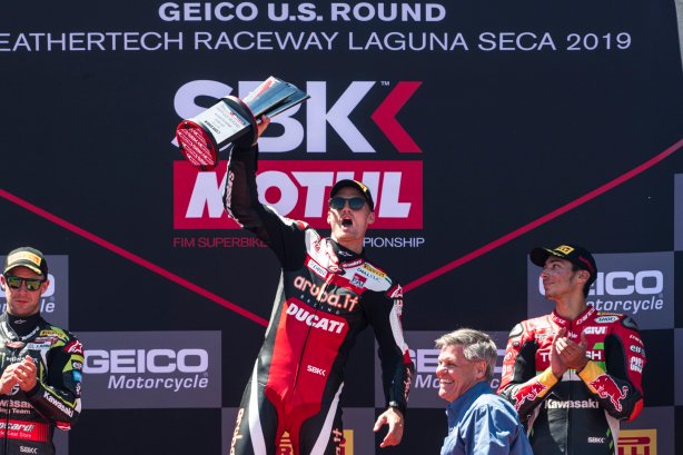 Giornata da incorniciare oggi per Chaz Davies che, sul circuito di Laguna Seca in California, torna alla vittoria dopo quindici mesi da Aragon 2018. Dopo aver disputato la sua 200esima gara nel Mondiale Superbike nella Superpole Race della mattina, il 32enne pilota gallese mette a segno la sua 30esima vittoria con una prestazione maiuscola in Gara 2, dominando dall’inizio alla fine e tagliando il traguardo con un vantaggio di tre secondi sul suo rivale principale, Rea su Kawasaki.