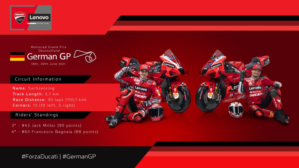Il Ducati Lenovo Team è pronto a tornare in pista per disputare l’ottavo appuntamento del Campionato Mondiale MotoGP 2021, il Gran Premio di Germania, in programma questa domenica sul celebre circuito del Sachsenring, nei pressi di Chemnitz.