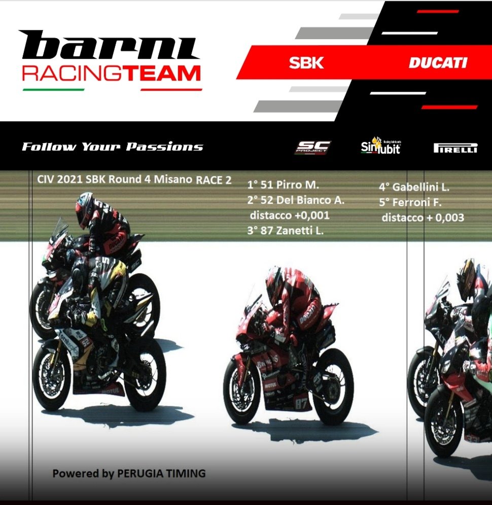Non è la prima volta che Pirro compie un’impresa del genere con una moto del Barni Racing Team. Era il 24 settembre 2017 e al Mugello Pirro cadde alla prima curva di gara 2, sul bagnato, ma fu capace di rimontare e andare a vincere con margine. Questa volta lo ha fatto in un’altra pista e in un’altra condizione atmosferica: ai 35 °C di Misano Adriatico.