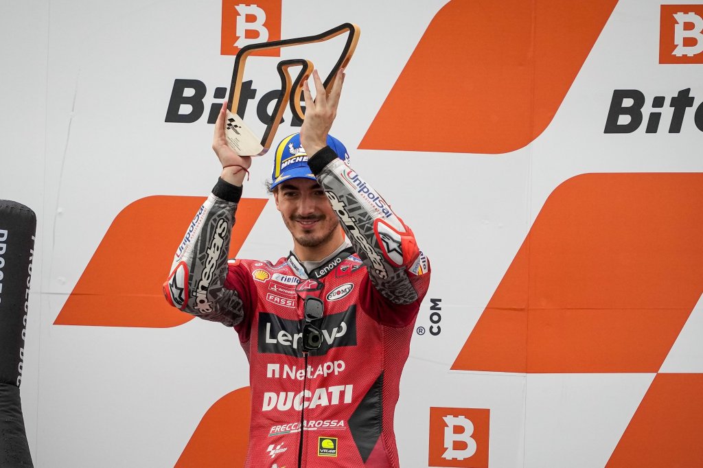 Partito con il terzo tempo dalla prima fila, Pecco si è portato subito in prima posizione, rimanendo al comando per ventitre giri, difendendosi abilmente dagli attacchi prima di Quartararo e poi di Márquez. Quando è iniziata a cadere la pioggia, il pilota italiano è scivolato al quarto posto, ma non ha tardato ad effettuare il cambio moto, rientrando ai box insieme ai piloti del gruppo di testa. Rientrato in gara in undicesima posizione con la Desmosedici GP in assetto da bagnato, Bagnaia ha presto raggiunto i piloti rimasti in pista con le gomme slick, riuscendo a recuperare fino al secondo posto nell’arco di un solo giro e conquistando così il suo quarto podio stagionale. Grazie al risultato di oggi, Pecco sale anche in seconda posizione nella classifica generale, a 47 punti dal leader Quartararo.