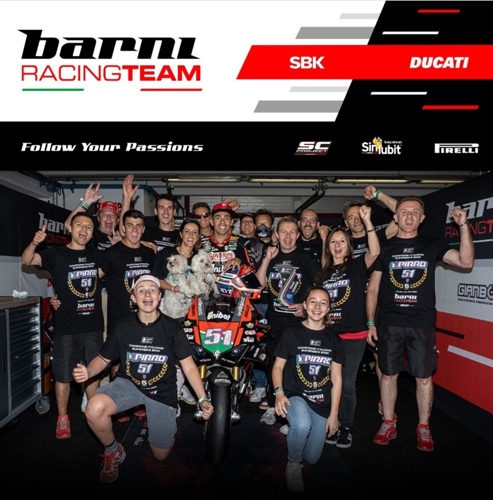 Michele Pirro conquista per la quinta volta il titolo di Campione Italiano nella classe Superbike con il Barni Racing Team. Per la squadra guidata da Marco Barnabò si tratta della dodicesima vittoria nella classifica riservata ai team. Una vittoria arrivata al Mugello Circuit dopo una gara che il #51 ha dominato, restando in testa dalla prima all’ultima curva. Pirro ha ottenuto l’ottava vittoria in nove gare disputate questa stagione e ha messo tra sé e tutti gli avversari un divario incolmabile con ben tre gare di anticipo.