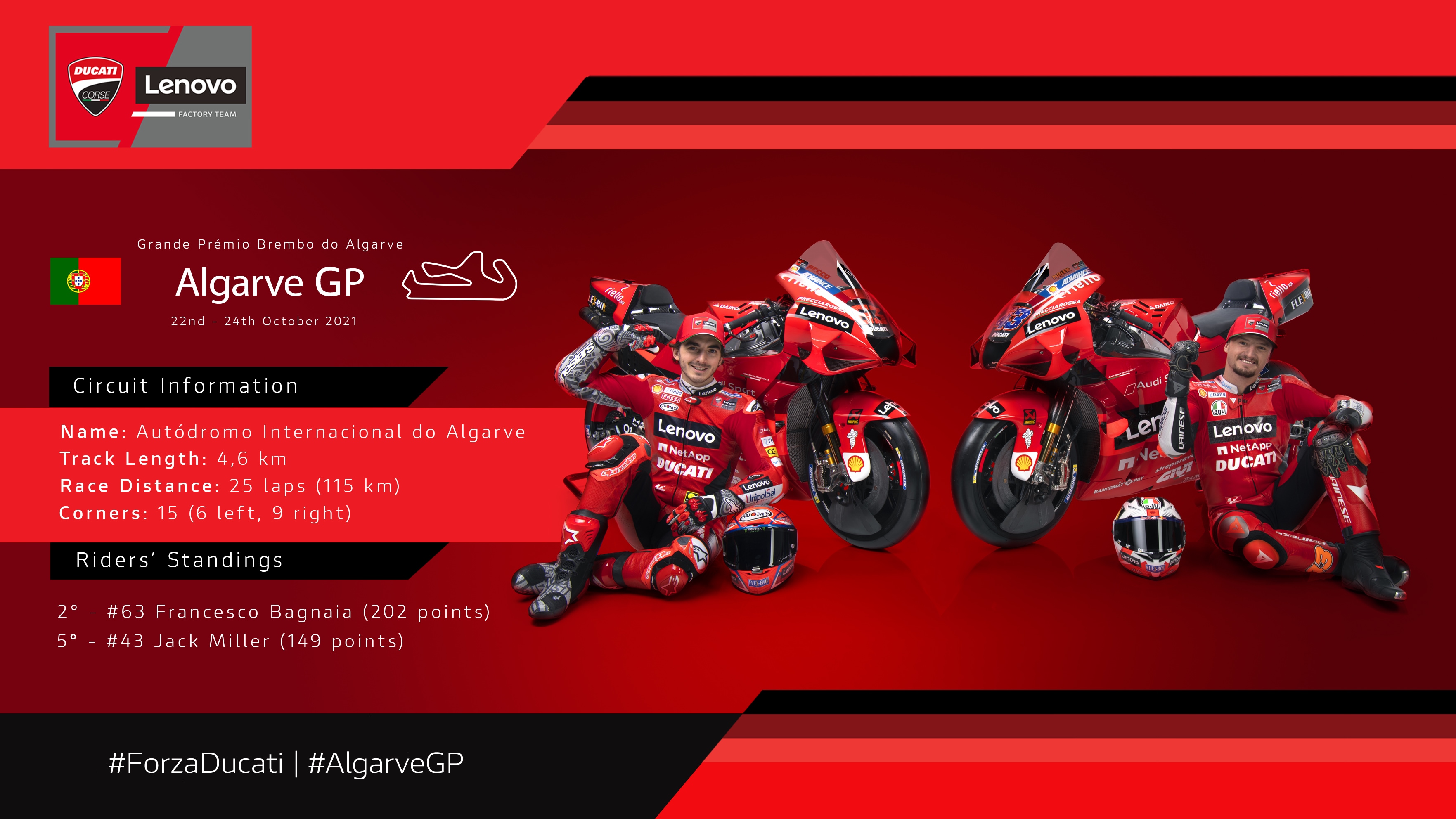 I piloti del Ducati Lenovo Team sono pronti a ritornare in pista questo fine settimana per affrontare la penultima tappa del Campionato Mondiale MotoGP sul celebre Autodromo Internacional do Algarve di Portimão (Portogallo), già teatro lo scorso aprile del GP del Portogallo, primo appuntamento europeo della stagione 2021.