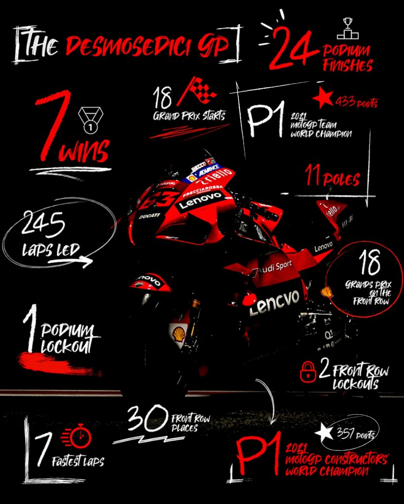 – Per il secondo anno consecutivo e il terzo nella sua storia in MotoGP, Ducati ha vinto il Campionato Mondiale Costruttori nella classe regina. Cinque sono i piloti ad aver contribuito alla vittoria del titolo con 357 punti totali: Pecco Bagnaia (167 punti), Jack Miller (63 punti), Johann Zarco (86 punti), Jorge Martín (25 punti) ed Enea Bastianini (16 punti).