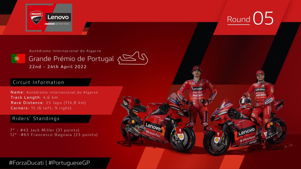 Il circuito, situato nella regione dell’Algarve ed introdotto in calendario nel 2020, ha ospitato il mondiale in già tre occasioni. Nella più recente, il GP dell’Algarve dello scorso ottobre, entrambi i piloti del Ducati Lenovo Team sono saliti sul podio. Francesco Bagnaia, partito dalla pole position grazie al nuovo record del circuito firmato in qualifica, si è assicurato il terzo successo stagionale firmando anche il giro più veloce in gara, mentre Jack Miller, partito secondo alle spalle del compagno di squadra, ha tagliato il traguardo terzo, portando a quota 4 i podi ottenuti da Ducati sul tracciato portoghese.