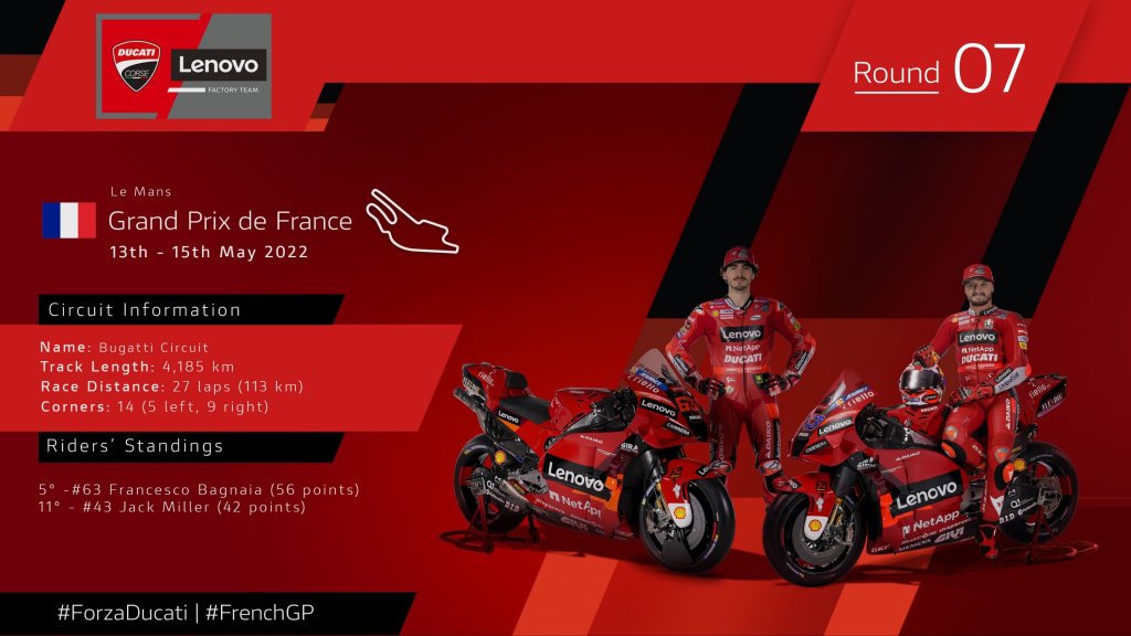 Presente in calendario ininterrottamente dal 2000, il celebre tracciato della regione della Sarthe ha visto Ducati ottenere finora undici podi tra cui due vittorie. La casa di Borgo Panigale è stata infatti la vincitrice delle ultime due edizioni del Gran Premio di Francia. Nel 2020 fu Danilo Petrucci ad ottenere una spettacolare vittoria sul bagnato, mentre lo scorso anno Jack Miller centrò il suo secondo successo consecutivo con la Desmosedici GP in una gara resa rocambolesca dalla pioggia e da un “flag-to-flag”.