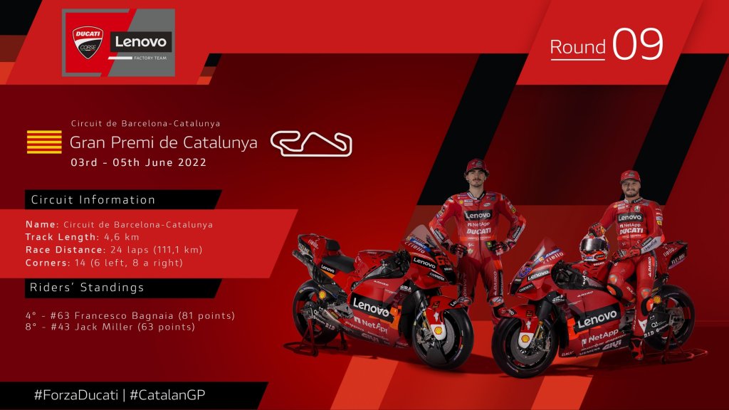 A meno di sette giorni dal GP d’Italia e dalla fantastica vittoria ottenuta da Pecco Bagnaia davanti al pubblico di casa, il Ducati Lenovo Team torna in pista questo fine settimana per affrontare il nono appuntamento della stagione MotoGP 2022, il Gran Premio della Catalogna.