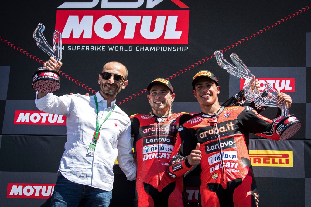 Il Pirelli Emilia Romagna Round inizia in modo fantastico per il team Aruba.it Racing – Ducati che festeggia sotto il podio la vittoria di Alvaro Bautista ed il terzo posto di Michael Rinaldi.