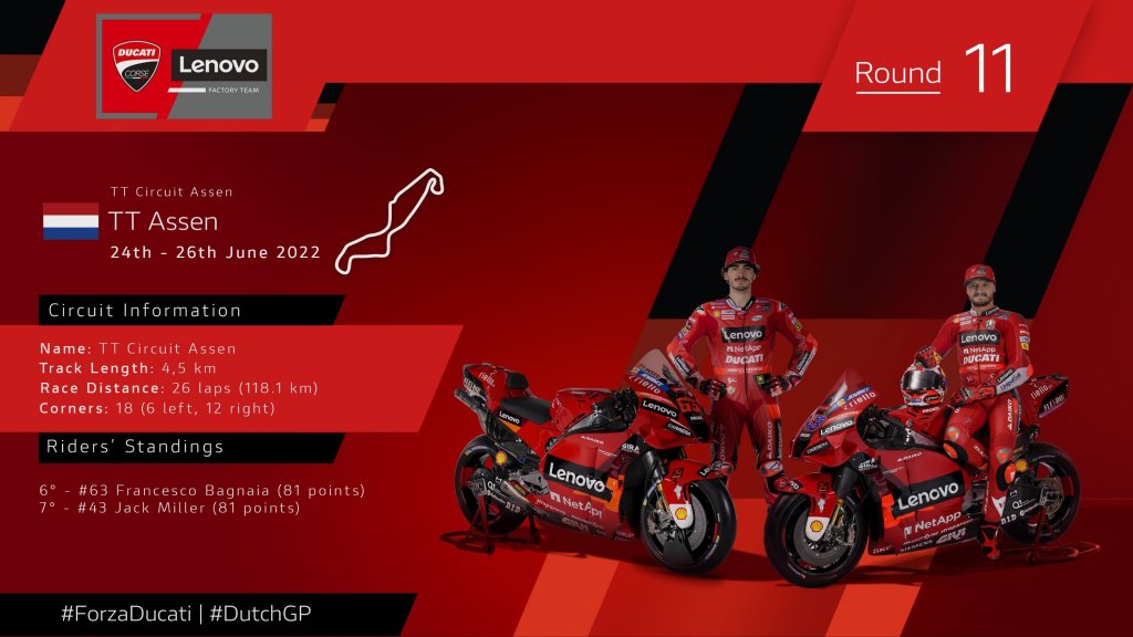 Il Ducati Lenovo Team scenderà in pista per la FP1 sul TT Circuit Assen questo venerdì 24 giugno alle 9:55 locali. Il GP d’Olanda prenderà invece il via domenica 26 giugno alle ore 14:00 CEST, sulla distanza di 26 giri.