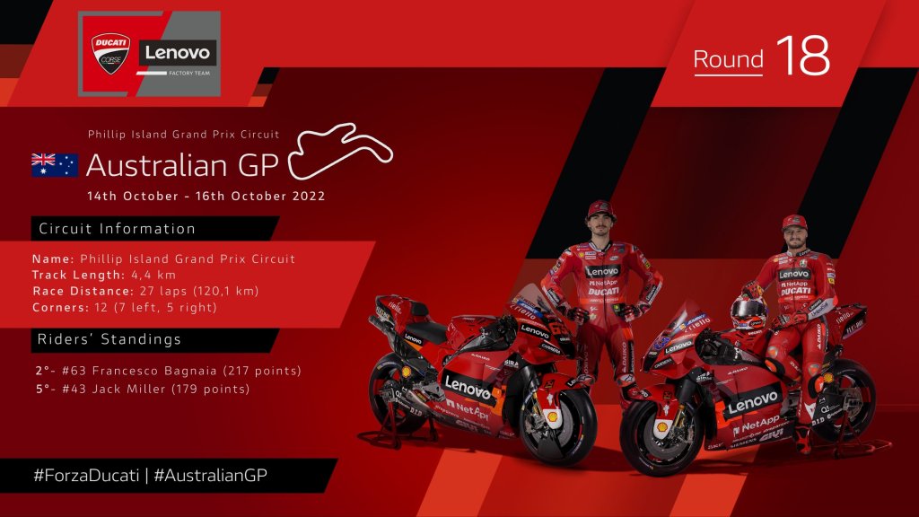 Il Ducati Lenovo Team è arrivato in Australia per disputare, questo fine settimana, il terzultimo appuntamento della stagione MotoGP 2022, il GP d’Australia sul circuito di Philip Island.