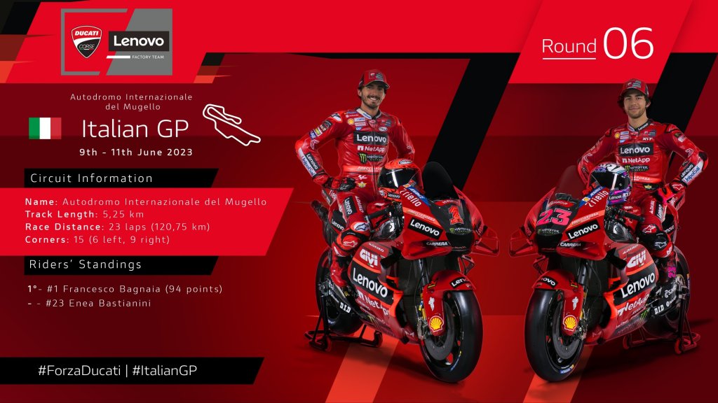 Dopo una pausa di tre settimane, il Ducati Lenovo Team è pronto a scendere in pista per uno degli appuntamenti più attesi da tutti i tifosi italiani. La MotoGP torna infatti in Italia, sui famosi saliscendi dell’Autodromo Internazionale del Mugello, per il sesto Gran Premio della stagione 2023.