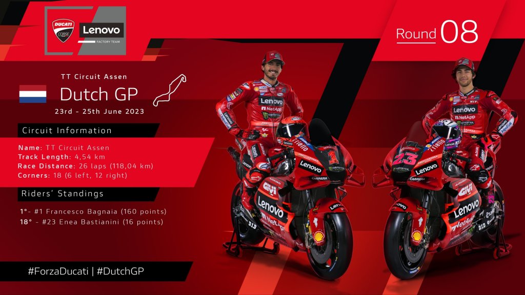 I piloti del Ducati Lenovo Team scenderanno in pista sul TT Circuit Assen per le prime Libere dell’ottavo appuntamento della stagione MotoGP 2023 venerdì alle ore 10:45 locali. La Sprint del GP d’Olanda si correrà sabato alle ore 15:00 locali, mentre il GP prenderà il via domenica alle ore 14:00.
