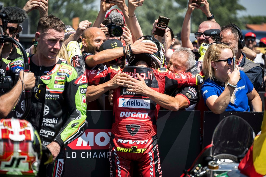 Gara-1 dell’Italian Round all’Autodromo Enzo e Dino Ferrari di Imola regala un grande spettacolo a tutti gli appassionati di WorldSBK. Locatelli (Yamaha), Bassani (Ducati), Razgatlioglu (Yamaha) si sono alternati al comando con Alvaro Bautista (partito dalla quarta posizione) sempre nel gruppo di testa. Poi l’avvincente duello tra il pilota del team Aruba.it Racing – Ducati e Razgatlioglu. Bautista prende la testa a 8 giri dal termine e la sua progressione è decisiva fino alla bandiera a scacchi.
