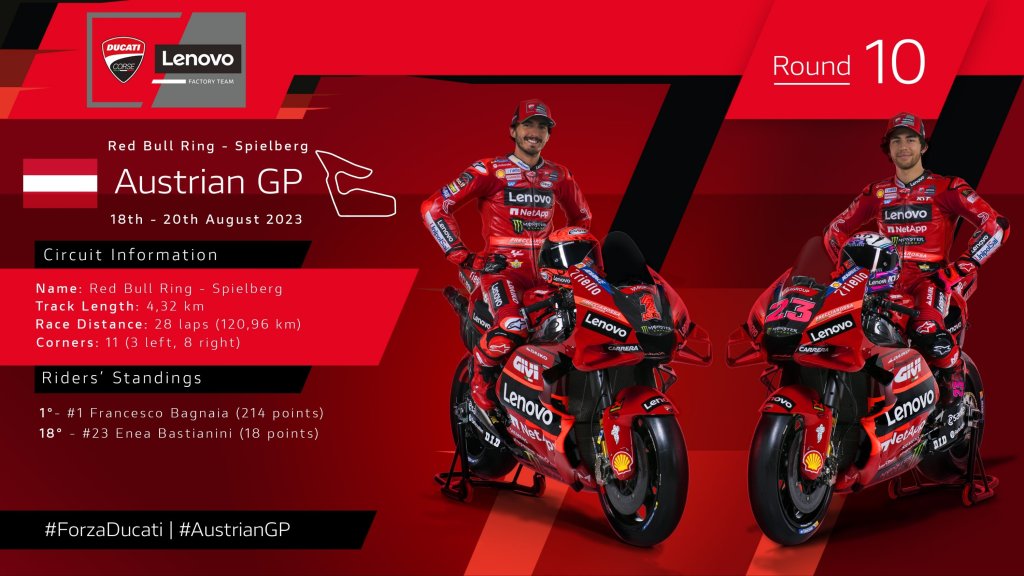 Dopo i primi 10 appuntamenti del 2023, Francesco Bagnaia è in testa alla classifica generale con 4 vittorie, ottenute nei Gran Premi di Portogallo, Spagna, Italia e Olanda, 3 vittorie Sprint e 6 podi totali, tra cui il secondo posto ottenuto in Gran Bretagna a Silverstone due settimane fa. Il Campione del Mondo in carica ha attualmente un vantaggio di 41 lunghezze sul compagno di marca Jorge Martin (Pramac Racing) secondo, e 47 sul terzo classificato Marco Bezzecchi (VR46 Racing Team).