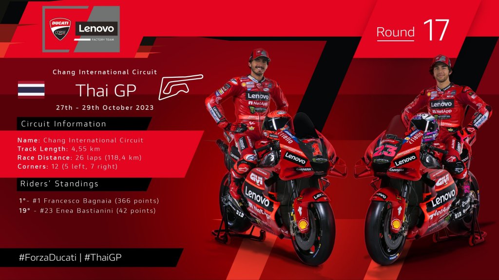 Dopo aver corso in Indonesia ed Australia, il Ducati Lenovo Team è arrivato in Tailandia per disputare l’ultimo Gran Premio della penultima trasferta tripla della stagione MotoGP 2023. Ad ospitare il diciottesimo appuntamento del Mondiale sarà ancora il Chang International Circuit di Buriram.