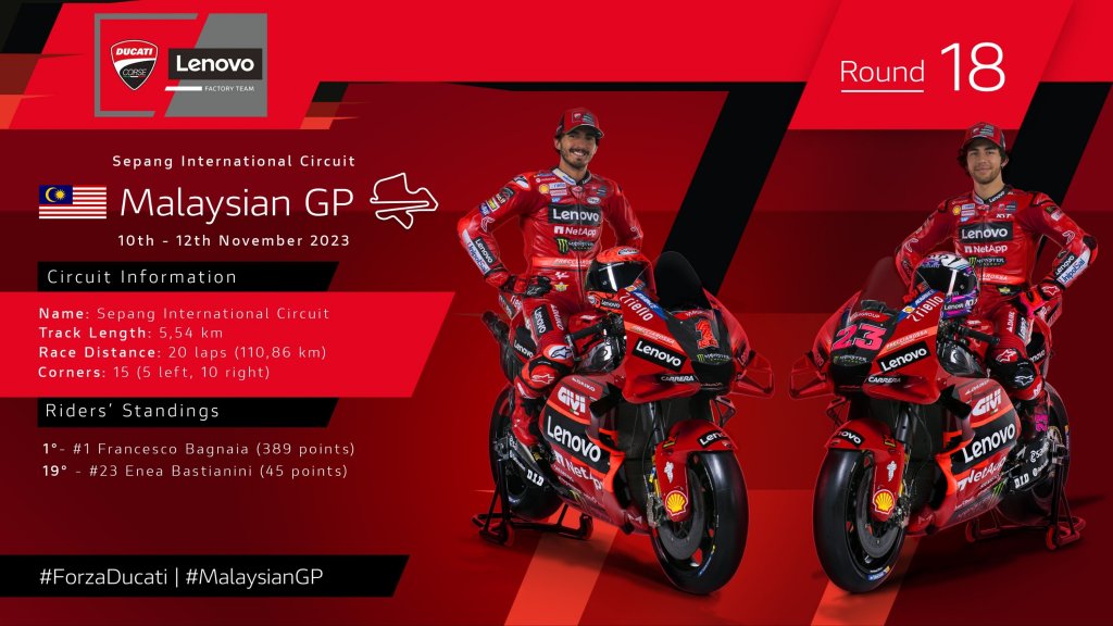 Il Ducati Lenovo Team è pronto a tornare in pista in Malesia per affrontare il primo appuntamento dell’ultima tripla trasferta della stagione 2023. Dopo Sepang resteranno infatti solo altri due Gran Premi: il GP del Qatar e il GP della Comunità Valenciana, in programma nei due fine settimana successivi.
